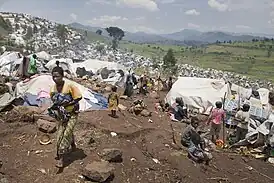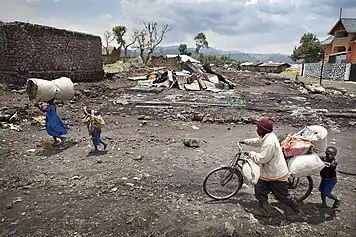 Since 2012, Kitchanga has been affected by the protracted conflict that has engulfed the region, becoming a site of violence and mass displacement.[16][17][18][19] On 20 November 2012, the March 23 Movement (Mouvement du 23 Mars; M23) seized control over significant portions of North Kivu Province, eventually capturing the provincial capital of Goma.[20][21] The M23's reign was characterized by widespread human rights abuses, including the recruitment of child soldiers, the rape and sexual violence against women and girls, and the forced displacement of civilians. Consequently, Kitchanga has become a shelter for those fleeing violence while simultaneously serving as a contested town, a rebel stronghold, and a volatile battleground where clashes unfolded.[15][22][23][24]