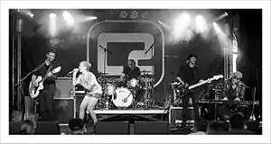 Klee frequently performs live,[16] giving up to 150 concerts each year.[9] The band’s appearances ranged from performances at small venues[22][23] to opening for established bands such as The Wedding Present and Nena.[24] Outside Germany, Klee has performed in London and Amsterdam, and also in Turkey, Russia and China following invitations from the Goethe-Institut.[23] For live performances, additional musicians including drummer, bassist and guitarist are added to Klee’s lineup[23] and the band adopts a greater "rock sound" than in its studio recordings.