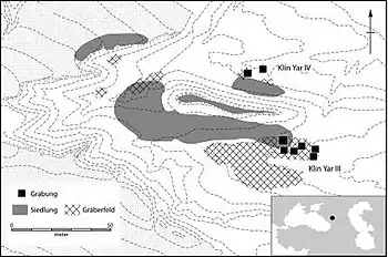 Location and site plan of Klin-Yar (drawn by M. Mathews; NB scale error: correct 500m, not 50m). Legend: Grabung - trench, Siedlung - settlement, Gräberfeld - cemetery