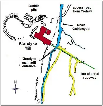 The route of the tramway from Pandora mine can be seen running down the hill on and embankment on the southern side of the Capel Curig road and the stream. As it approaches lake Geirionydd it swings to the right, to cross the present day road, before heading for the lake shore. The route alongside Llyn Geirionydd can be discerned in places today, running along the lake's length between the road and the lake shore in a small cutting. (This road was not built until about the 1940s.) North of the lake, the tramway route is a flat path, now a right of way, and part of Trefriw trail No. 5,[11] and on the hillside directly above the mill some minor remains of the loading platform, water tank and pipeline can be seen. From here it can be seen where the aerial runway ran steeply down to Klondyke mill.