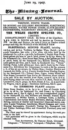 The Welsh Crown Spelter company still retained a few men on its books, to safeguard its assets, and a catalogue of these assets was prepared. In June 1907 an auction advertisement (see bottom picture) subsequently appeared in the Mining Journal, selling many of the mechanical assets of the Welsh Crown Spelter Co., and divided into 'Electrical Mining Plant', mostly from Pandora mine and 'Dressing Plant', from Klondyke mill.[1] Pertinent to the Klondyke operation, this sale included the like of 100 tons of 18 lb flat-bottom rail, a petrol locomotive of 22.5" gauge, 25 side-tip wagons, and 800' of Henderson cableway. The dressing plant on offer included a stone breaker and several jiggers, pulleys and belts, the contents of smiths' and carpenters' shops, telephone installations, drawing instruments, office and household furniture, and a pony and trap. It is clear from the full list of auction items that the mill was very dependent on electricity for its operation. This may also have contributed to the decline, for pumping equipment in particular was prone to failure.[1]