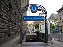 Klosterstraße is a Berlin U-Bahn station located on the U2 in the centrally located Mitte district. The eponymous street is named after the Graues Kloster, a medieval Franciscan abbey, which later housed the Berlinisches Gymnasium zum Grauen Kloster.