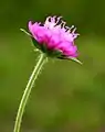 Its flowers are united into so-called calathidium inflorescences, that are surrounded by lanceolate involucral leaves. Each zygomorphic flower consists of four floral leaves, with petals being scarlet, scarlet red, purple and in rare cases even white. The plant's sepals are reduced into very short and pointy flower bristles, that are usually in groups of 8. Knautia drymeia has so-called inferior ovary, with flower elements being set above it.[3]