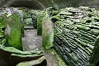 Archaeological excavation during the 1930s revealed a rectangular-shaped cairn measuring 15 m (49 ft) by 8 m (26 ft) externally and situated northwest–southeast. The cairn encloses a burial monument measuring 8 m (26 ft) by 2 m (6 ft 7 in) with a surviving height of 2 m (6 ft 7 in). The roof to the tomb had been removed at some point when the tomb was robbed. The exterior walls of the tomb display decorative stonework which can be seen near the entrance.[4] The original burial chamber contained four compartments separated by pairs of upright slabs. Entrance to the main chamber is through a 4 m (13 ft) passage on the southeast. Excavation uncovered the skeletal remains of at least 29 people, 36 deer, several sheep and a dog. Also found were pottery sherds, four arrowheads, five bone tools and several pieces of flint. Historic Environment Scotland established the site as a scheduled monument in 1994.[1][3]