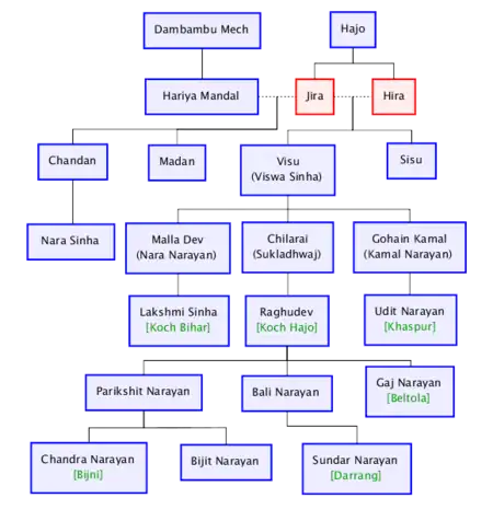 As part of these alliances Hajo's daughter Hira married Hariya Mandal, a member of the Mech tribe from Chiknagram in present-day Kokrajhar district,[15] though these ethnic identities are difficult to discern since there were frequent intermarriages.[16][17] Bisu, born to Hariya and Hira,[18] acquired the political legacy of his grandfather Hajo[19] and established himself as the chief of the eastern branch of the Koches in the Khuntaghat region (present-day Kokrajhar district of Assam).[20][21] It is thought that Bisu fought under the leadership of the Bhuyans as a landlord against the occupation of Kamata kingdom by Alauddin Husain Shah and thus learned their military tactics.[22]