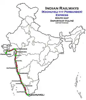 The 20909 / 10 Kochuveli−Porbandar Superfast Express runs from Kochuveli via Ernakulam Junction, Mangalore Junction, Madgaon Junction, Panvel, Vasai Road, Palghar, Ahmedabad Junction, Rajkot Junction to Porbandar.[3]