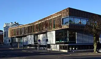 In June 2007, a feasibility study on the library's future expansion was initiated. It was reported in August 2008. Twenty-four architectural offices sought to design the new arts center, out of which four were selected to make suggestions. In June 2009, the design proposed by Nyrén Architectural Office was chosen. The construction work began in September 2010.[1] During the construction period, the public library housed in temporary premises in a former school in the adjacent block to the northeast. Komedianten was inaugurated on 14 January 2012 by the President of the Municipal Council, Margareta Lorentzen, and the Chairman of the Culture and Recreation Board, Christofer Bergenblock, with the participation of the percussion ensemble Komodo and the actress Maria Lundqvist, who portrayed her character the librarian Sally Santesson from the 1999 comic television series Sally.