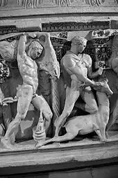 The Roman Period Hall has displays of antiquities from 30 BC to 395 AD from Iconium of "Sidemara type marble Herakles Sarcophagus with columns (250-260 AD)", pottery, glassware, ivory and ornaments; Byzantine Period (395-1453 AD) artifacts of "base mosaics" from Tatköy Church in Sille, Tatköy, Çumra, Alibeyhöyük, and Kilise, and also "bronze door knockers, cauldron handles, rolickers, crosses, marks and arrow ends" of the period.[1] The prominent exhibits here are the 3rd century marble sarcophagus with carved scenes from the life of Hercules, a sarcophagus made in clay of the Roman period, a marble sarcophagus with engraved festoons, a 2nd-century sculpture of Poseidon, and religious stone slab of the goddess Cybele (the Anatolian mother goddess).[2]