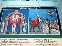 As per Hindu legend, a ruler named Vallabhadeva went incognito everyday to know about the lives of people under him. During one of his visits, a scholar told him that the ultimate goal in life is to "collect provisions in summer and save for winter", which also meant that one should work during his younger days and save for his old age. Vallabadeva was not convinced and he set this as a competition among scholars to make him realize the true value of life. Vishnucitta, who would later go on to become Periyalvar, one of the twelve most revered saints of Vaishnava sect, came to Madurai from Srivilliputhur. He was believed to have been directed by the heavenly words of Vishnu and he expounded the sacred verses. He explained the concepts of Hitham and Purushartham from Vedas and proclaimed that attained the feet of Narayana could lead to salvation. Vallabhadeva was pleased with the explanation and he awarded a bag of gold to Visnucitta. It is believed that the current gopuram of Srivilliputhur Temple, was built by Periyalvar with the gold won.[2]