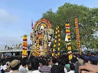 On the 16th day, the image of Aravan is repainted and paraded during the festival throughout the village until the deity reaches the mourning grounds, where the brides become widows and wear white sarees, remove their thaalis and break their bangles to spend a day as widows, mourning the death of Aravan.[6] Throughout the festival