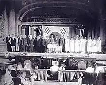 The March 1st Movement in 1919 rekindled the national spirit of Korean-Americans. When news of the demonstrations reached the US in mid-March, a mass rally was held by the KNA in San Francisco. The KNA first attempted to send a three-man delegation including Syngman Rhee to the Paris Peace Conference but failed to receive necessary travel documentation. Afterwards, the KNA decided to establish a Korean Information Office headed by Philip Jaisohn then send him and Syngman Rhee to Philadelphia to lead "the Korean Congress" held from April 14 to 16 of the same year to begin blueprinting the future Republic of Korea with 150 Koreans representing 27 organizations in the US and Mexico.[1] All organizations agreed upon a Korean republic based on democratic principles and pledged their support to the newly established Korean Provisional Government (KPG) in Shanghai. Ahn Changho, who was in Shanghai at that time, played an instrumental role in the government's establishment on April 13 and its early operations. After its formation, Syngman Rhee felt that the KNA fulfilled its goals and should let the government‐in‐exile lead the cause. Therefore, he proposed that the KNA rename itself to the Korean Residence Association which KNA members firmly rejected. This caused a factional split and the founding of The Comrade Society in Hawaii by Syngman Rhee and his supporters.[6] Despite internal conflicts, the spike in activity within the KNA continued on until the mid-1920s when it lost its steam in the liberation movement and would not regain it until the Sino-Japanese War in 1937.[7] However, the KNA continued to launch independence funds which for the following decades collected money from Korean immigrants to financially support the provisional government and anti-Japanese activities.[2]