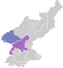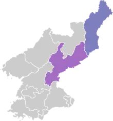 Hwanghae province has been divided into South Hwanghae province and North Hwanghae province since 1954. Thanks to the wide Yonbaek and Chaenyong plains, Hwanghae province is a granary of North Korea and is known for its good quality cereal production.[33] As the millet seeds produced in the region are thick, and have a good taste, they are eaten as much as barley is consumed by people of the southern region. The abundant production of cereal crops provides quality feed for livestock, so the quality of meat produced in the region is said to be good. Chicken raised in every household is fleshy and of good quality, and is used for many dishes in Hwanghae cuisine. It is used as an ingredient for wheat noodle dishes, and mandu (dumplings). The coastal area, adjacent to the Yellow Sea, produces a lot of salt because the tideland in the area is developed and there is little rainfall.[33] Due to the climate, kimchi in the Hwanghae region has a clear and refreshing taste, so its brine is used as a soup on many occasions. Dongchimi brine is used as a broth for naengmyeon (cold buckwheat noodle dish), or for mixing with a bowl of chilled rice to make a midnight snack. The Hwanghae people are known for kindheartedness and rustic simplicity, so their cuisine reflects their nature. Hwanghae dishes are savory and simple, with less decoration such as mandu made in a larger size than other regions. The general taste is moderate, similar to that of Chungcheong province.[3]