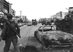 The Koza riot (コザ暴動, Koza bōdō) was a violent and spontaneous protest against the US military presence in Okinawa, which occurred on the night of December 20, 1970, into the morning of the following day. Roughly 5,000 Okinawans clashed with roughly 700 American MPs in an event which has been regarded as symbolic of Okinawan anger against 25 years of US military occupation.[1][2] In the riot, approximately 60 Americans and 27 Okinawans were injured, 80 cars were burned, and several buildings on Kadena Air Base were destroyed or heavily damaged.[3][4]