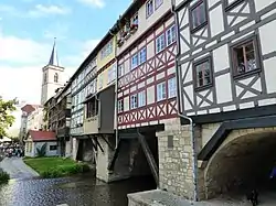 The construction of the houses on the Krämerbrücke was completed in 1486, following a fire in 1472 which destroyed nearly half of the city and the market stalls on the stone bridge.[3][5] Sixty-two timber-framed buildings were built on each side of the stone bridge, creating a street between the two rows.[5] Later, the small houses were gradually merged, so that there are now 32 houses on the bridge. They have shops on the ground floor and living accommodation above.[7] They are the longest rows of inhabited buildings on any bridge in Europe.[8]
