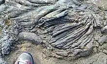 The lavas of Kapelluhraun ([ˈkʰaːpɛtlʏˌr̥œyːn], "chapel lava") from historical time (erupted around 1150)[12] have been given this name because of a medieval chapel whose ruins are still standing on them. A small statue of Saint Barbara was found at the place.[13] The Kapelluhraun lava field consists of pāhoehoe and ʻaʻā lava which streamed from the highland down to the bay of Straumsvík near today’s aluminium smelter and there into the sea.[12] The events were part of a ca. 30 years long unrest period in the late 12th century which is called Krýsuvík Fires. This unrest period included repeated eruption series and rifting episodes and is recorded in Flateyjarbók.[12]