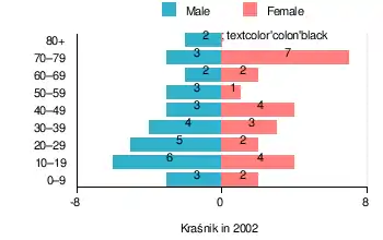 According to the 2002 Poland census, there were 56 people residing in Kraśnik village, of whom 55.4% were male and 44.6% were female. In the village, the population was spread out, with 21.4% under the age of 18, 37.5% from 18 to 44, 12.5% from 45 to 64, and 28.6% who were 65 years of age or older.[1]