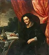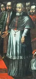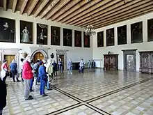 The upper parts of the walls are covered with a painted frieze, while the spaces between the windows are filled with 17th-century portraits of the Cracow bishops – Jakub Zadzik and his successor Piotr Gembicki, kings Sigismund III and Władysław IV and coat of arms (same as on the facade).[5] The other walls were covered with a painted effigies of the Cracow bishops – 35 busts of bishops from Paweł of Przemanków (1266–1292) to John Albert Vasa (1632–1634) dating back from the first half of the 17th century. The lower row of 16 portraits from Jakub Zadzik to Karol Skórkowski (1830–1851) was painted by Aleksander Rycerski,[1] who in the years 1861–1863 carried out a refurbishment of the upper frieze. The dining room lead to the most distinguished suites – the "Bishops apartment" on the left and the "Senator apartment" on the right.[5] The rooms were adorned with carved, gilded frame ceilings filled with oil paintings, created in Kraków workshop of Tommaso Dolabella,[1] an Italian painter active in Poland since 1598,[5] who participated in the decoration of the Palazzo Ducale in Venice.[15][16]