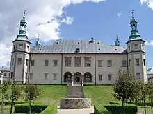The residence of the Kraków (Cracow) bishops in the city of Kielce,[3] was founded by bishop Jakub Zadzik, Great Crown Chancellor.[4] The structure, erected between 1637 and 1644, was covered with a high-storey twin roofs and accomplished with towers on the corners.[5]