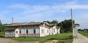 The wooden station dates from 1899, and has been preserved in its original form. The station's water tower dates from the same period, and has also been preserved. The station was originally built to serve the branch line that was extended from Sonkovo railway station to Krasny Kholm, as part of the Rybinsk-Pskov-Vindava railway. The line was later extended to Ovinishchi, and then to Vesyegonsk railway station in 1919. The Mologsky passage from Saint Petersburg was then extended to Ovinishchi, creating a reserve railway link between Saint Petersburg and Moscow.[1] The pre-revolutionary station building has the status of an object of cultural heritage of regional significance.[2]