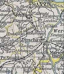 The continuous growth of the population prompted a district reform in West Prussia. In October 1887, the new Dirschau district was created, consisting of parts of the Danzig district and the Preußisch Stargard district. The seat of the district office and the only town in the district was Dirschau (today Tczew). The district had a German majority and a significant Polish minority.[3]