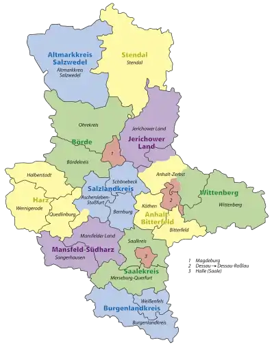 Kreisreform Sachsen-Anhalt 2007 (or Kreisgebietsreform 2007) is a law in Saxony-Anhalt, Germany that came into effect on July 1, 2007, which outlines a reform of the districts of Saxony-Anhalt. It reduced the districts from 24 to 14. Nine new districts were created by amalgamating existing districts, while the rural districts of Altmarkkreis Salzwedel and Stendal as well as the urban districts of Halle and Magdeburg were untouched.[1]