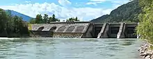 Kreuzbergmaut dam consists of a weir (length 36 m) with 3 sluice gates on the left side and a machine hall on the right side.[1]