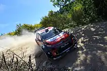 Meeke led the next rally, the Tour de Corse, but retired from the lead with an engine problem on the Novella stage.[14] At Rally Argentina, Meeke retired again. He rolled his C3 twice in the course of the rally, one of these times seeing the car rolling 14 times, which he described as "the biggest."[15] He was replaced with Andreas Mikkelsen for Rally Poland, which team principal Yves Matton described as being 'in the best interests of the team."[16] Meeke returned for Rally Finland, but struggled for confidence and eventually finished eighth, whilst teammate Craig Breen challenged for a podium. This was followed up by a crash on the Thursday evening super special stage on Rallye Deutschland, ruining any chance of scoring points. He eventually retired on day 2 with a mechanical issue. However at the next round in Spain, Meeke took the lead from Andreas Mikkelsen on the second day, and steadily pulled away from the rest of the field to take a second victory of the season.