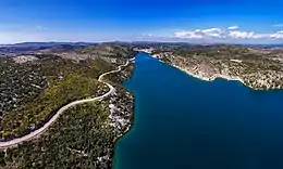 From this point on, the river is navigable from the sea. The river flows past the town of Skradin on the right, flowing into the 5 km (3.1 mi) wide Prokljansko lake, into which the Guduča river flows on the right. After that, the river empties into the 10 km (6.2 mi) long Bay of Šibenik, which is connected to the Adriatic Sea by the Canal of St. Anthony, at the Fortress of St. Nicholas.[4]