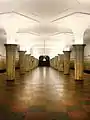 Since it was to serve as the gateway to the Palace of Soviets, great care was taken to make Kropotkinskaya suitably elegant and impressive. The station has flared columns faced with white marble which are said to have been inspired by the Temple of Amun at Karnak. Contrary to popular opinion, the marble used in the station did not come from the demolished Cathedral. The spacious platform is covered with squares of gray and red granite and the walls, originally tiled, are now faced with white Koyelga marble. The station is illuminated by concealed lamps set into the tops of the columns.