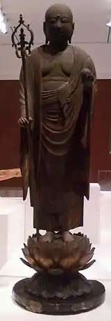 Jizō is garbed in traditional monk's attire, lacking ornate jewelry and adornments typically seen on images of Bodhisattvas.[2] He is shown in a standing position, with his right foot slightly forward, a common pose for this bodhisattva used to indicate his physical presence walking through the present world.[3] In his right hand Jizō carries a six ringed alarum staff, or khakkhara, used to warn insects of his presence, and in his left hand he carries a cintamani jewel, believed to light up the dark as well as grant wishes.[1] Below Jizō is situated an open lotus flower, a traditional Buddhist symbol of purity amidst the imperfections of the physical world.[4]