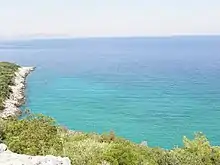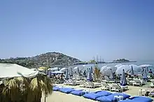 A beach in Kuşadası, with Güvercinada island seen in the background, at right.