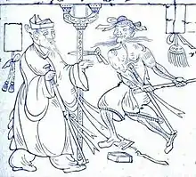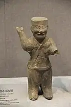 In this period, the kun developed into new styles of Chinese trousers, such as dashao (Chinese: 大袑) which were trousers with extremely wide legs and the dakouku (Chinese: 大口褲), which was a type of trousers which were tied with strings under the knees in this period.[3] The kun however was rarely used by the general population and were only used by warriors and servants during this period as the members of the high society were still deeply influenced by the traditional etiquette of the Han culture and found the kun disgraceful for allowing the exposure of its wearer's leg shape; moreover, people had difficulty adjusting to the use of the kun in their everyday lifestyle and routines as they were used to their traditional ku.[3] In the chapter Jijiupian《急就篇》by Shi You during the Western Han dynasty, the zheku (Chinese: 褶袴) consisted of the zhekukun (Chinese: 褶袴褌), a wide-legged kun which were bound with strings at the around the knees, and was worn with a tight knee-length chanyu (Chinese: 襜褕) robe.[3][15]