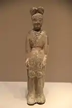 During the Wei, Jin, Northern and Southern dynasties, the dakouku (especially the wide-bottomed dakouku) became a common form of kun amongst the nobles and the commoners.[3] This style of knee-bound kun was also known as fuku.[3] By binding the trousers below the knees, the dakouku would facilitate movements,[16]: 435 including when horseback riding or when men were on duty.[14]: 319 The chord used to bind the knees were made out of felt in the Western Jin; however, as the use of felt was a product of the Eurasian steppes; it was assumed to be Hufu by the contemporary observers of this period.[14]: 319 In fact, while the dakouku was designed under the influence of the ancient Hufu-style hedangku, it was a Chinese innovation and was not a form of Hufu.[14]: 319 In the Northern Wei, some women started to wear dakouku instead of skirts under the influence of the northern nomads.[14]: 322 When the dakouku was matched with a tight knee-length upper garment, it formed the kuzhefu,[3] which then became both the military and official attire in both the north and south of China at those times.[14]: 319 The kuzhefu was a popular form of attire until the Sui and Tang dynasties.[3]