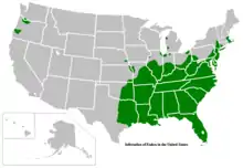 Kudzu was intentionally introduced to North America by the Soil Erosion Service and Civilian Conservation Corps in the 1930s for the purpose of controlling soil erosion in the American Southeast.[7] When kudzu was first introduced in the southeast, it was initially used as an ornamental vine to shade homes. By the early 20th century, southerners began to use kudzu for purposes other than ornamentation and so kudzu began to come closer in contact with the land which, in turn, encouraged its spread throughout the southeast.[1] In the 135 years since its introduction, kudzu has spread over three million hectares (ha) of the southern United States, and continues to "consume" the south at an estimated rate of 50,000 hectares (120,000 acres) per year, destroying power lines, buildings, and native vegetation, according to a 2006 study.[21] This claim, however, was disputed in 2015 with the United States Forest Service estimating an increase of 2,500 acres (1,000 ha; 10 km2) per year.[3] In the United States, kudzu is extensively reported in Alabama, Arkansas, Washington, D.C., Delaware, Florida, Georgia, Illinois, Indiana, Kentucky, Louisiana, Maryland, Missouri, Mississippi, North Carolina, North Dakota, New Jersey, Oregon, Ohio, Pennsylvania, South Carolina, Tennessee, Texas, Virginia, and West Virginia. Of these states, three in the southeast have the heaviest infestations: Georgia, Alabama, and Mississippi.[1]