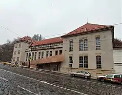 The Kunsthalle is located below Prague Castle on in the Malá Strana district. The building was originally constructed between 1930 and 1931 by the City of Prague Electricity Works as a transformer station.[7] Previously, there was a barrack on the site. The design by architect Vilém Kvasnička was executed in the neoclassical style,[8] which corresponds to the historical character of the area. The Transformation Station was named after the physicist and meteorologist Václav Zenger, a professor at the Czech Technical University in Prague.[9]