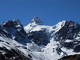 Other peaks in the Kunturiri massif are Pico Reya (5,495 metres (18,028 ft)), Qallwani (Yugoslavia) (5,492 metres (18,018 ft)) 2 km north of Kunturiri, Wintanani (5,428 metres (17,808 ft)), Pico Eslovenia (5,381 metres (17,654 ft)), Pequeño Alpamayo (5,370 metres (17,618 ft)), Pico Medio (5,355 metres (17,569 ft)), Ilusión (5,330 metres (17,487 ft)), Aguja Negra (5,290 metres (17,356 ft)), Jist'aña (5,260 metres (17,257 ft)), Diente (5,200 metres (17,060 ft)), Ilusioncita (5,150 metres (16,896 ft)), Tarija (5,060 metres (16,601 ft)) and Titicaca (4,968 metres (16,299 ft)).[8] The Spanish names of the peaks do not occur in the maps of the Bolivian IGM (Instituto Geográfico Militar).[1][9]