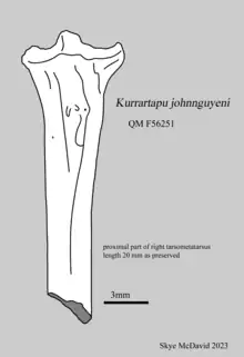 Kurrartapu johnnguyeni is an extinct species of bird in the Australian magpie and butcherbird family. It was described from Early Miocene material (a proximal tarsometatarsus) found at Riversleigh in north-western Queensland, Australia. It is the first Tertiary record of a cracticid from Australia. The size of the fossil material indicates that it was similar in size to the living black butcherbird. The generic name is a Kalkatungu language term for the Australian magpie. The specific epithet honours John Nguyen, the father of the senior describer.[1]
