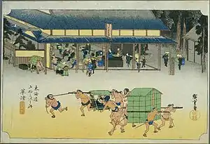 Utagawa Hiroshige's ukiyo-e Hōeidō edition print of Kusatsu-juku dates from 1833 -1834. The print depicts a busy scene within the post station itself in front of the open-fronted Yōrō-tei (養老亭) tea house in which many patrons are enjoying Ubagamochi (姥が餅), a sweetened sticky rice cake which was a speciality of Kusatsu-juku. The tea house was so named by Tokugawa Ieyasu after he stopped here following his victory at the Battle of Sekigahara and was presented with a rice cake by proprietor, a 84-year old former wet nurse of the Sasaki clan who had escaped the destruction of her clan at the hands of Oda Nobunaga. Afterwards, the tea house was mentioned by Matsuo Basho, Yosa Buson and other noted travelers. In front of the tea house, on the highway itself, a passenger in an open kago (palanquin) holds on to a rope as the porters rush to his destination, while a larger, covered kago, presumably for a high status passenger, heads in the opposite direction.