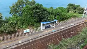 Kushi Station consists of a side platform serving a single track on a sidehill cut. There is no station building, only a simple shelter for waiting passengers. A steep access road leads up to the platform from the main road. A bike shed is provided at the base of the access road.[2][5][3]