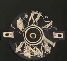 Greek kylixes and other vessels during the Archaic period frequently depicted activities such as athletic training events that were favored by their users, the majority of which were part of the aristocracy.[7] Kylixes where often used at symposiums which were all male drinking parties. Symposiums were considered an integral part of Greek culture and was an activity reserved for only the most elite of society.[8] The party was held in a private home where the men would get together to drink, eat, sing and discuss various topics such as philosophy and politics; the only women who were allowed to attend were high-class entertainers. It was an activity that served to reinforce the status and bond of the aristocracy.[8] Athletic events were also an important part of Greek culture as they believed in the importance of training their bodies just as much as they trained their minds.[9] The Grecian youths of elite families would train under athletic trainers at a palaestra or a wrestling school.[9] These training sessions where a key part of youth socialization in society.[7]