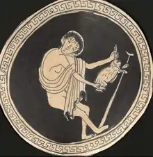 On the pancration scene there is one inscription that reads "Panaitios kalos" which is translated to "Panaitios is handsome".[1] In many of his kalos inscriptions, Onesimos uses the name Panaitios which misled many to believe that there was a Panaitios Painter whose work was earlier than Onesimos. It is now accepted, however, that the Panaitos Painter and Onesimos are the same.[4] In the boxing scene there are two inscriptions; one reading "Lukos kalos" or "Lykos is handsome" and the other on the discus bag reading "Kalos" or "handsome".[1] The final inscription is found in the tondo and it reads "Ho pais kalos" or "The boy is handsome".[1]