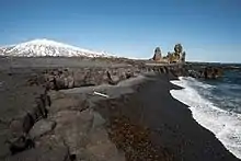The Lóndrangar (Icelandic pronunciation: [ˈlounˌtrauŋkar̥]) are a pair of rock pinnacles in Iceland. They are volcanic plugs of basalt, that have been hewn out from softer surrounding rock by erosion. At 75 and 61 m tall, they are a singular sight, rising above and outside the ocean front due east across from Malarrif [ˈmaːlarˌrɪːf] and some 10 km from Hellnar, on the southern coast of Snæfellsnes peninsula. History has it that the taller of the cliffs was ascended in 1735, while the smaller one was not climbed until 1938.[1]