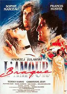 L'Amour braque (English: Mad Love) is a 1985 French romantic drama film directed by Andrzej Żuławski and starring Sophie Marceau, Francis Huster, and Tchéky Karyo. The film is about a bank robber on his way to Paris who meets a neurotic dreamer whom he considers to be an idiot. The dreamer follows him everywhere and soon falls in love with his girlfriend, resulting in a tragic ending. The film is loosely inspired by Fyodor Dostoevsky's 1869 novel The Idiot.[2] The film received a Fantasporto International Fantasy Film Award Nomination for Best Film in 1986.[3]