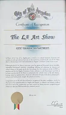 In 2020, Kassandra Voyagis stepped up to assume management and leadership as Producer-Director of the show. Navigating the pandemic, the show was rescheduled the following year, and returned as an in-person show in July 2021. Los Angeles Mayor Eric Garcetti attended the opening and presented the show with a Certificate of Recognition from the City of Los Angeles for the many contributions LA Art Show has made over the years.