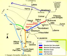 The LGV Rhin-Rhône (French: Ligne à Grande Vitesse; English: high-speed line) is a French high-speed rail line, the first in France to be presented as an inter-regional route rather than a link from the provinces to Paris,[1] though it actually is used by some trains to/from Paris. The first phase of the eastern branch opened on 11 December 2011. Construction of its second phase was initially expected to start in 2014 but still has no funding.