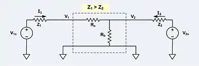 If a source and load are both resistive (i.e. Z1 and Z2 have zero or very small imaginary part) then a resistive L pad can be used to match them to each other. As shown, either side of the L pad can be the source or load, but the Z1 side must be the side with the higher impedance. [2]