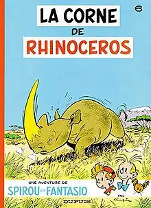 La corne de rhinocéros, written and drawn by Franquin, is the sixth album of the Spirou et Fantasio series. The material was first serialised in Spirou magazine in two parts, Spirou et la Turbotraction and the sequel La corne de rhinocéros, and finally merged into one for the release of the hardcover album in 1955.