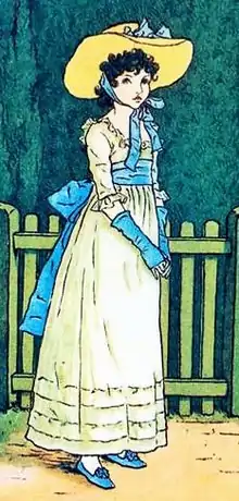 Susan Blue (c. 1885) by Kate Greenaway. Her drawings inspired a popular fashion line for young girls in the late 19th Century. The subject of "La Diva de l'Empire" would have worn a similar outfit to tease her male fans.