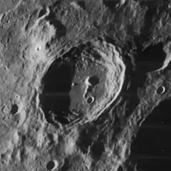 La Pérouse is a lunar impact crater that is located near the eastern limb of the Moon. It lies northwest of the larger crater Ansgarius, and to the east of Kapteyn. This crater appears foreshortened due to its location, but the rim is nearly circular when viewed from orbit.