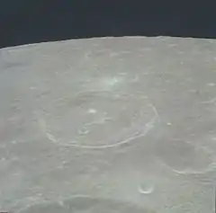 Oblique Apollo 12 image facing northwest. The small bright crater beyond the far rim is La Pérouse A, and beyond it in the central background is Von Behring